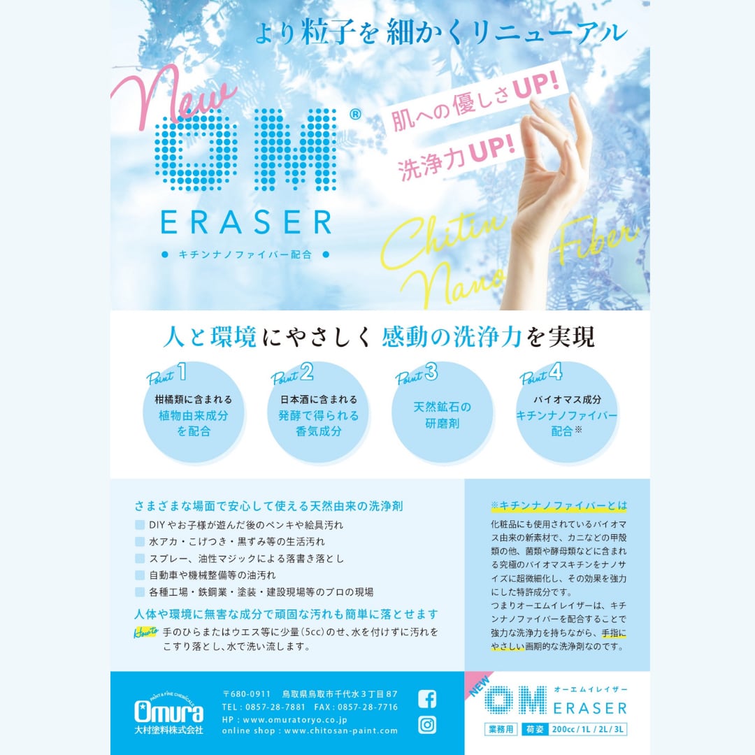 OM(オーエム)イレイザーは、塗料やインク、機械油などの落としにくい汚れを落とせる3つの天然由来成分を使用した人と環境に優しいエコクリーナーです。